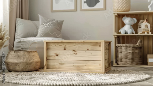 Wooden toy box in a cozy and organized children's room.