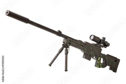 Wooden toy sniper rifle with telescopic sight isolated on white background