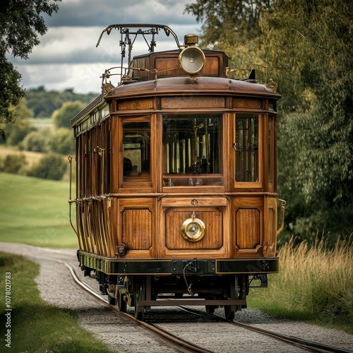 vintage, wooden, train, tram, antique, retro, transportation, historic, railway, vehicle, old, classic, nostalgic, travel, public, transport, carriage, locomotive, rail, track, wheel, passenger, journey, rural, countryside, green, grass, landscape, summer, cloudy
