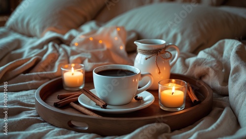Wooden tray featuring coffee, milk, cinnamon sticks, and tea candles on the bed, cozy ambiance