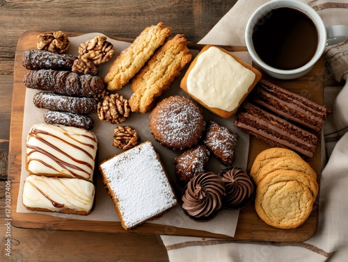 pastry, hot drink, dessert, wooden, tray, parchment, paper, overhead, view, assorted, variety, sweet, treat, baked, good, cookie, cake, chocolate, icing, sugar, walnut, cosy, tempting, delicious, food, photo, styling, flat, lay, top, breakfast, brunch, afternoon, tea, snack, indulgence, bakery, cafes, eatery, homemade, epicure, rustic, background, table, setting, culinary, still, life, drink