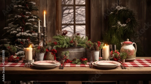 wooden, winter, table, background, illustration, rustic, plaid, clothes, vintage, plate, mug, cosy, inviting, vase, evergreen, branch, berry, festive, centrepiece, decor, setting, holiday, warmth, charme, style, design, atmosphere, seasonal, arrangement, aesthetic, ambience