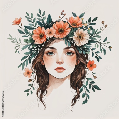 timberland, forest, nymph, floral, crown, design, plain, white, background, woman, beauty, hair, face, fashion, flower, flower, spring, model, vector, illustration, nature, art, coiffure, make-up, person, summer, head, pink, lip, glamour, style, leaf, people