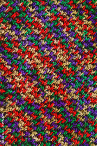 woolen scarf close up - vertical fabric background. Multicolored threads