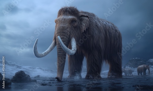 Wooly mammoth standing on the ground, with long white tusks and long thick fur covering its large body