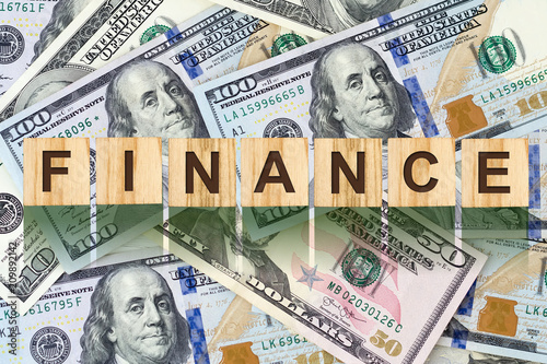 Word, Finance composed of letters on wooden building blocks against the background of dollar bills. Concept business, finance.