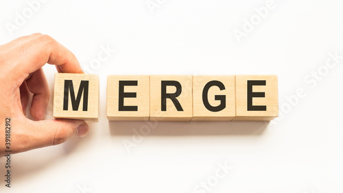 Word merge. Wooden small cubes with letters isolated on white background with copy space available.Business concept
