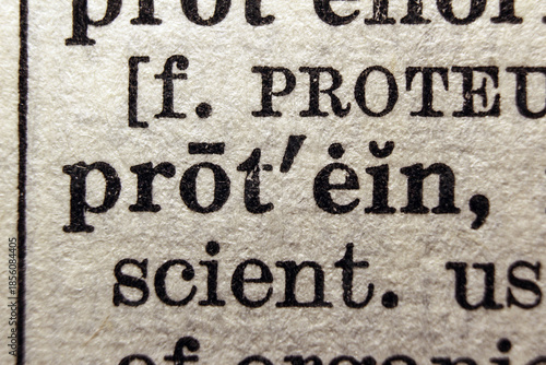 Word protein printed on dictionary page, macro closeup