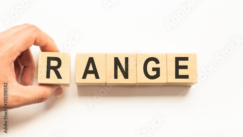 Word range. Wooden small cubes with letters isolated on white background with copy space available.Business Concept image.