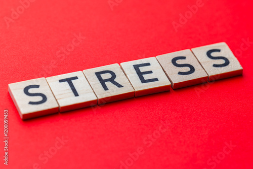 Word Stress, composed with wooden alphabet blocks, on red surface.