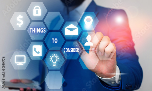 Word writing text Things To Consider. Business photo showcasing think about carefully especially in making decisions