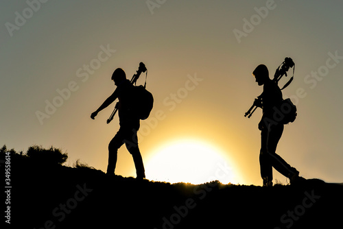 photographer, occupation, job, work, media, group, silhouette, walking, adventure, photo, video, back, hill, mountain, adventurous, machine, tripod, duet, friends, friendly, sunshine, sunset, sunrise, sun, lifestyle