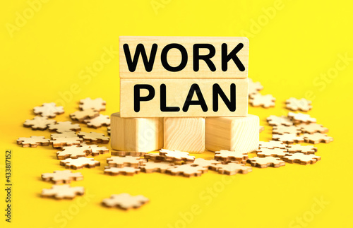 WORK PLAN. puzzles and wooden cubes with the text on a YELLOW background. Concept for management and business.