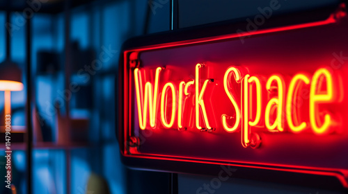 "Work Space" neon sign with wide angle view, modern office exterior with blue ambient lighting