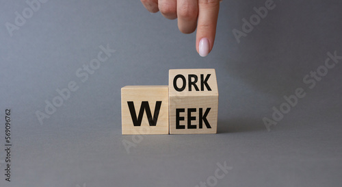 Work Week symbol. Businessman hand points at turned wooden cubes with words Work Week. Beautiful grey background. Business and Work Week concept. Copy space