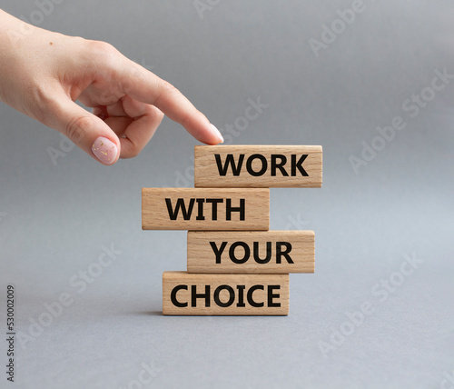Work with your choice symbol. Wooden blocks with words Work with your choice. Beautiful grey background. Businessman hand. We Work with your choice concept. Copy space.