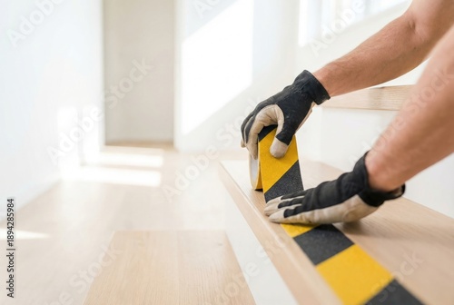 Worker applies safety tape on stairs in a bright indoor space during daytime for step visibility and safety