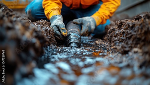 men at work, pipe, construction, ground, hose, connecting, man, labourer, glove, trench, water, drain, work, service, equipment, drainage, repair, installation, professional, hand, utility, industry, infrastructure, maintenance, job, detail, skilled, technician, site, project, team, contractor, engineer, safety, industrial, uniform, boot, closeup, sharpened