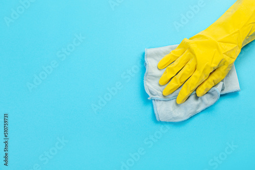 worker hand in a yellow rubber protective glove with micro fiber blue cloth wiping a blue wall from dust. A maid or housewife takes care of the house. Commercial concept for a cleaning company.