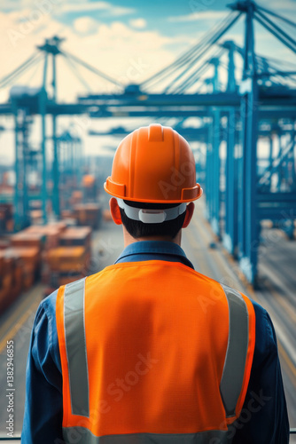 worker in orange hard hat and reflective vest stands at port, observing shipping containers and cranes in background. scene conveys sense of diligence and focus on logistics