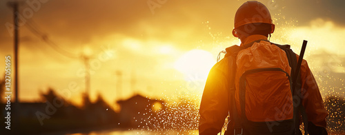 men at work, sunset, orange, helmet, backpack, resilience, hope, silhouette, nature, safety, construction, environment, landscape, water, evening, storm, preparation, emergency, disaster, management, teamwork, adventure, exploration, journey, protection, gear, equipment, glow, cloud, horizon, walking, rain, droplet, travel, activity, preparedness, sky, scenic, tranquil, calm, weather, photo, professional