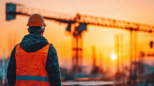 Worker in Safety Vest Observing Construction Site at Sunset