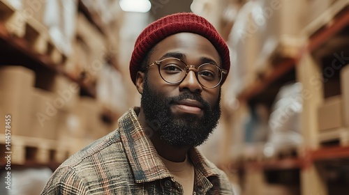 man, men at work, warehouse, employee, portrait, serious, focused, business, industry, labor, logistic, supply, chain, production, good, storage, cardboard box, distribution, personnel, retail, shipping, transportation, profile, african, black, goggles, clothing, fashion, portraiture, calm, confident, determined, industrial, commerce, manpower, professional, concentrated, person, face, people