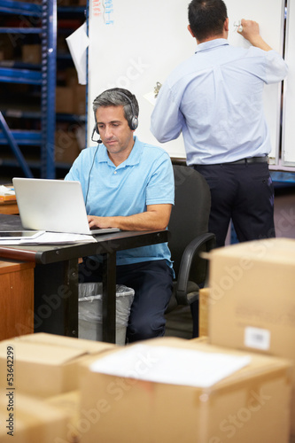 distribution, dispatch, logistic, box, warehouse, business, packing, cardboard box, headset, on the phone, phone call, communication, laptop, computer, courier, indoor, vertical, men at work, delivering, sending, retail, e-business, order, checking, assembly line, factory, whiteboard, colleague, people, person, hispanic, 40s, 40s, man, man, male, asian, two people