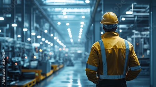 Worker in Yellow Jacket Observing Modern Industrial Facility with Advanced Equipment