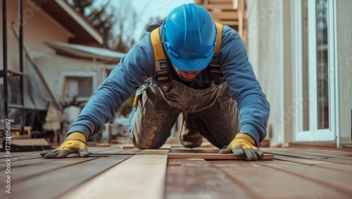 men at work, wooden, deck, construction, home, improvement, kneeling, hard, hat, glove, residential, area, work, sunlight, carpenter's shop, flooring, building, tool, timbering, renovation, craftsmanship, bricolage, house, safety, gear, wood, project, manual, labor, effort, summer