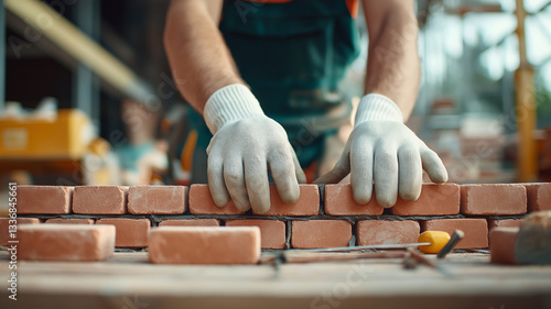worker is laying bricks on construction site, showcasing skilled craftsmanship and attention to detail. scene captures essence of building and hard work