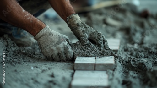 men at work, tile, construction, site, laying, hand, glove, mortar, building, labor, masonry, tool, floor, renovation, craftsmanship, project, manual, surface, repair, industry, process, skilled, design, interior, architecture, tile, cement, workspace, dirt, effort, precision, technique, installation, material, structure, artisan, job, hard hat, safety, environment, quality, task, layout, foundation