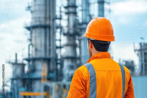 Worker observes industrial site with safety gear, focusing on equipment and structures