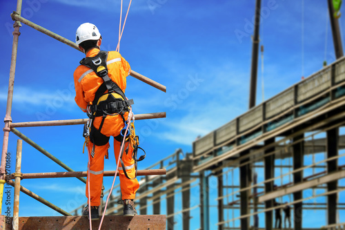 Worker on the high scaffolding wear equipment protective safety harness and ppe on structure steel factory site project background.