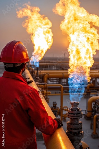 men at work, gas, flare, industrial, sunset, energy, safety, helmet, uniform, facility, flames, operation, evening, sky, industry, plant, observation, contrast, vibrant, sector, measure, engineering, infrastructure, equipment, technology, environment, power, production, process, management, supervision, maintenance, refinery, pipeline, combustion, heat, light, emission, atmosphere, dusk