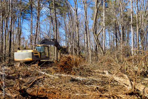 Worker uproots trees in forest with help of an excavator in preparation for building house