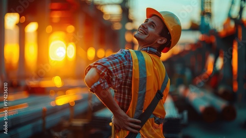Worker with back pain, construction site, holding back, sunset, dramatic lighting, low angle, gritty realism, golden hour