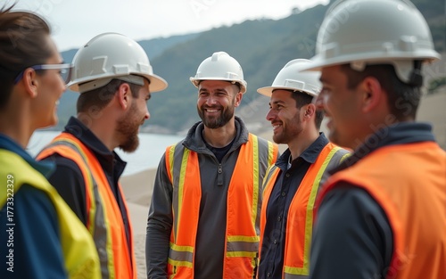 quarry, reflective, men at work, pride, teamwork, woman, adult, mid, people, full-length, young, business, mature, smile, jacket, vest, hard, work, hat, team, safety, front view, man, site, photo, posing, day, african american, outdoors, supervisor, happy, group, construction, portrait, co-worker