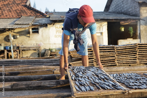 workers are arranging salted fish on bamboo trays to be dried and prepared for sale at the local market. traditional fishing industry at the fish market