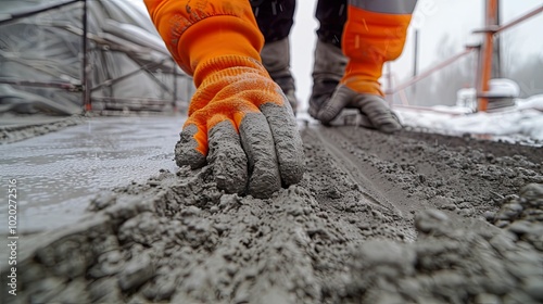 hand, glove, orange, concrete, wet, kneading, construction, men at work, building, job, work, site, project, grey, textured, rough, labor, industry, material, professional, safety, equipment, surface, cold, winter, snow, ground, muddy, dirty, messy, detail, perspective, low, angle, view, foreground, background, blur, sharpened