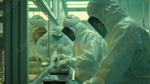 factory, men at work, clean, room, production, manufacturing, industrial, technology, safety, equipment, assembly, line, protective, clothing, suit, glove, mask, gloved, masked, laboratory, science, research, sterile, industry, machine, process, operation, facility, tech, workshop, work, engineering, gear, environment, professional, workwear