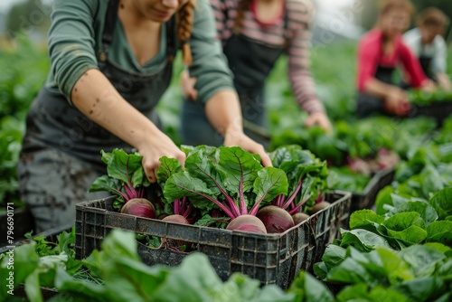 Workers in a farm picking vibrant organic beetroots, placing them carefully in a crate amidst leafy green foliage