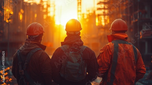 Workers in Safety Helmets Collaborate on Construction Plans Under a Bright Background