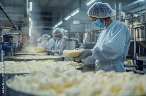 Workers in sterile clothes producing fresh cheese at dairy factory. Manual food manufacturing process with stainless steel tanks. Healthy european product, organic nourishment for economy,