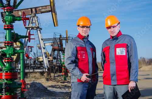 Workers in the oilfield, one holding radio in his hand. Pump jack and wellhead background. Oil and gas concept.