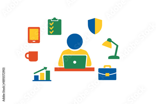 Working at a desk with computer, cup, lamp, and various icons representing productivity and organization in a bright digital space