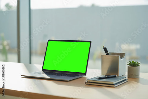 laptop, desk, computer, office, work, workspace, home, business, technology, modern, table, interior, design, equipment, electronic, portable, screen, green, display, digital, device, workstation, indoor, contemporary, simple, minimalist, copy space, blank, notebook, pen, crayons, holder, succulent, plant, concrete, pot, natural light, blur, window, background, tabletop, communication, cyberspace, connection, content, information, online