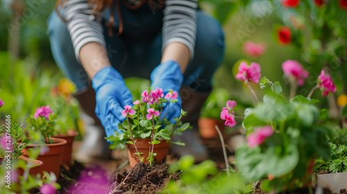 working in a flower shop, gardening, growing flowers at home. Woman repotting flower plants at home garden in denim clothes. flower in a pot