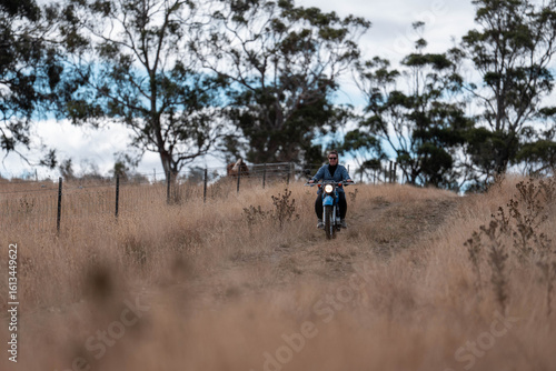working in agriculture. girl riding a motorbike on a farm in outback Australia. Ranch worker herding cattle and cows in a field with a dog on a gravel road. Young farmer mustering livestock.