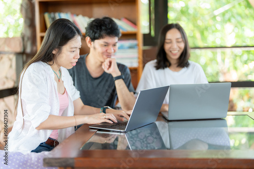 Working late in the university, 3 Asian students collaborate on a project, depending on a laptop to research education methods, industry standards, and possibilities for the future.